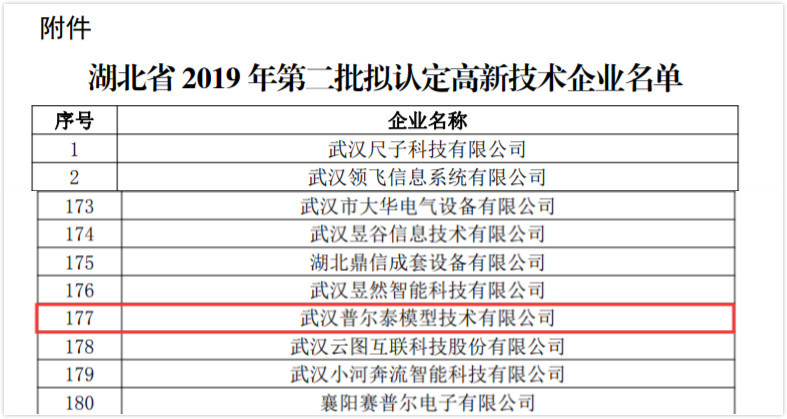近日,國家高新技術企業(yè)認定管理工作網(wǎng)發(fā)布《關于公示湖北省2019年第二批擬認定高新技術企業(yè)名單的通知》,武漢普爾泰模型技術有限公司榮列其中。經(jīng)過10個工作日的公示期,目前我公司已順利通過認定,由此正式邁入國家高新技術企業(yè)行列!